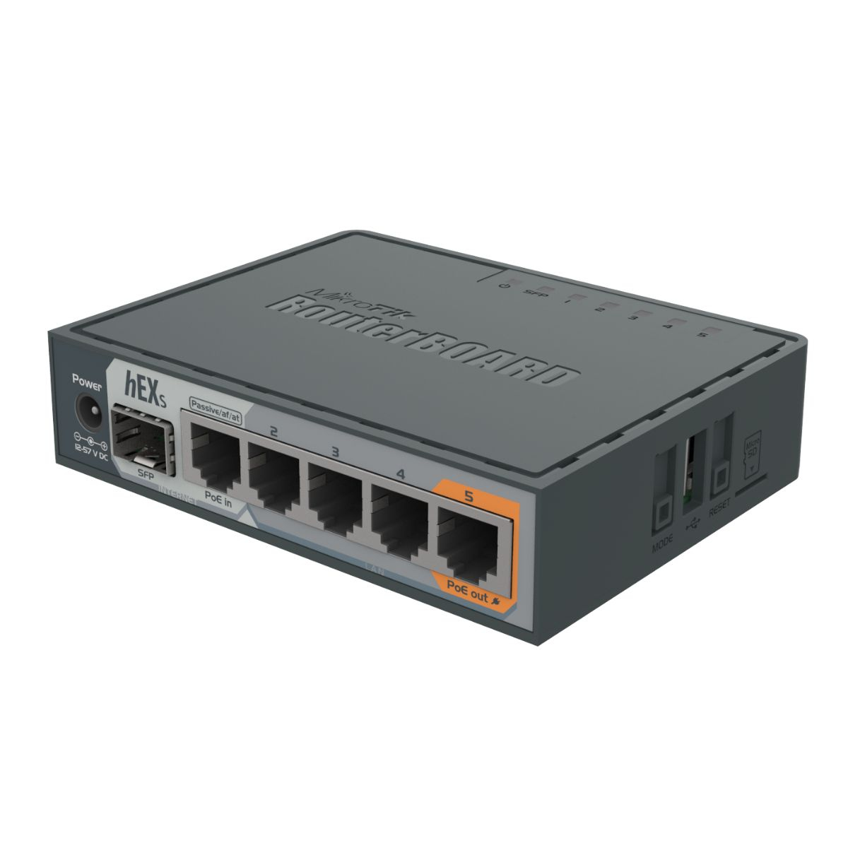 Router MikroTik - RB760IGS hEX S - 5 Puertos RJ-45 Gigabit Ethernet - 1 Puerto SFP (1.25 Gbps) para enlace de fibra - Puerto USB-A - Ranura microSD- Alimentación PoE IN entrada - PoE OUT salida - Administrado RouterOS - Tamaño de RAM: 256 MB - Tamaño de almacenamiento: 16 MB