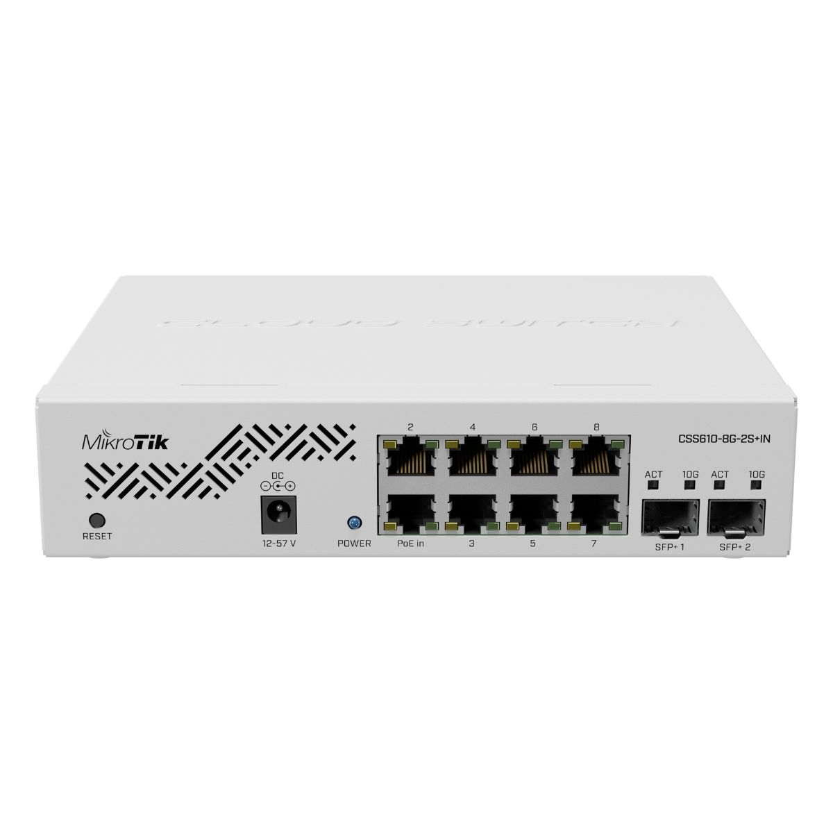 Switch Mikrotik - CSS610-8G-2S - 8 Puertos Ethernet 10/100/1000 Mbps (Gigabit) - 2 Puertos SFP+ (10 Gbps) - Administrado por SwOS - Tamaño de almacenamiento 64 KB - Alimentación entrada DC o PoE-in pasivo